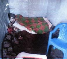 "Odeta's new mattress. Note: lava rocks on the ground from the nearby volcano."