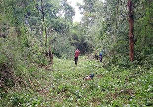 "Sunlight cuts a new path through dense bush to the maize field (garden)."